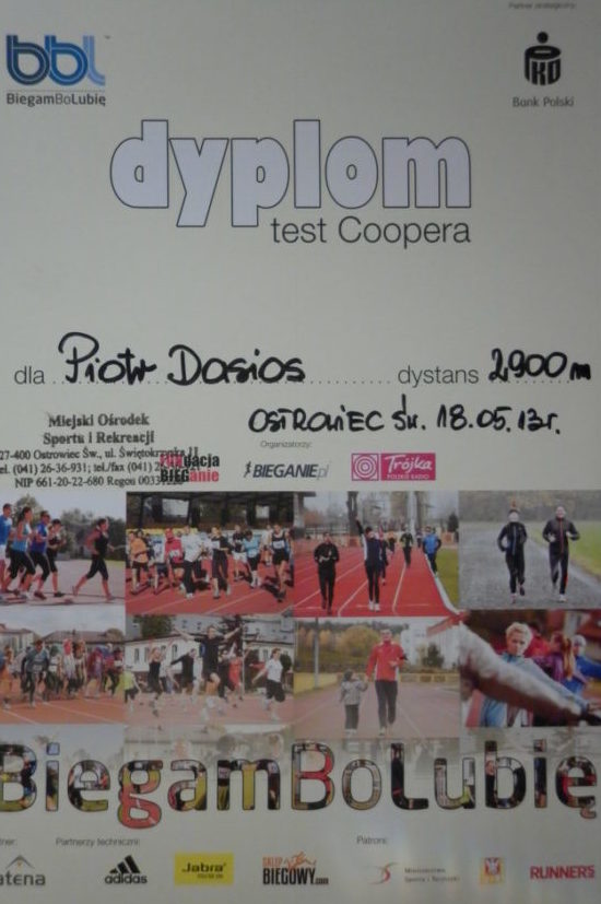 Prawdziwą motywacją dla mnie do biegania był Test Coopera, który był przeprowadzony na kolejnych zajęciach „Biegam, bo lubię”, w dniu 18 maja 2013 r. Zajęcia w ramach tej akcji są przeplatane różnorodnymi testami, które jesienią mają być powtórzone. Było już bieganie na 1km, test Coopera, bieganie na 100 m, ze startem w blokach startowych. Jesienią sprawdzimy czy nasze bieganie dało efekty, czyli czy poprawimy wyniki. Takie testy podwójnie motywują, nutka rywalizacji i czas, zmuszają ciało do maksymalnego wysiłku.