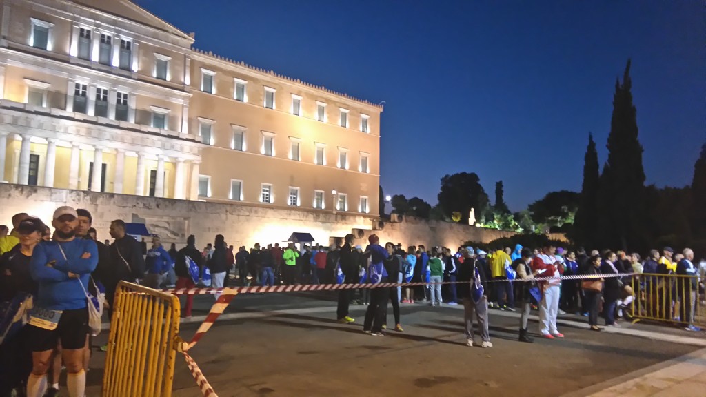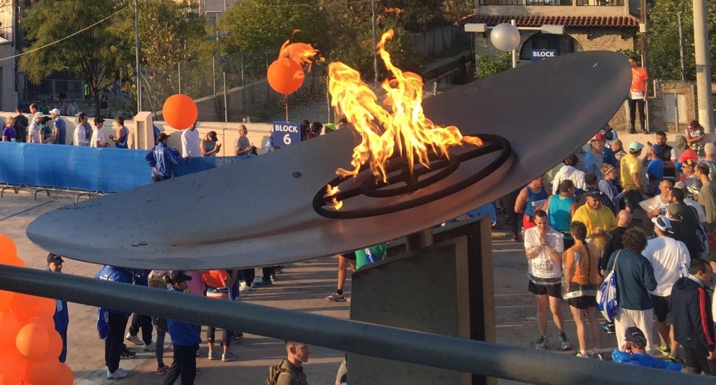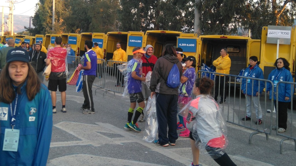 Na szczycie trybun wyróżnia się płonący znicz olimpijski, ponieważ Maraton Ateński to wielkie święto biegaczy, ale też wspomnienie idei olimpijskiej i pierwszego nowożytnego maratonu. Na stadionie przybywa biegaczy, z głośników płyną skoczne nuty piosenek, które pomagają w rozgrzewce. W tłumie wyróżniają się biegacze w strojach Spartan i liczna grupa maratończyków z Polski w strojach i perukach biało-czerwonych. Przez głośniki ogłaszane są komunikaty, w który przypomina się o tym, że można zostawić ubrania w ciężarówkach DHLu, których odjazd zaplanowany jest o godz. 8.30. Przed stadionem, w jednej linii ustawionych było kilkadziesiąt ciężarówek kurierskich, oznaczonych przedziałami numerów, co 400. Organizatorzy w pakiecie startowym zadbali o estetyczne i praktyczne worki oraz naklejki z numerem odpowiadającym startowemu. Ciężarówki będą czekać na biegaczy w parku tuż obok mety.