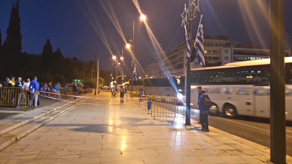 Jest jeszcze ciemno, kiedy wyruszam z hotelu w stronę metra, którym dostanę się do placu Sindagma, gdzie pod greckim Parlamentem są podstawiane autokary, aby przewieść biegaczy na linię startu w Maratonie (ok. 40 km). W drodze towarzyszył mi Wojtek, poznany w hotelu, biegacz z Warszawy. Punkt zbiorczy przy Parlamencie jest jednym z czterech punktów, zorganizowanych przy głównych stacjach metra w Atenach, stąd 300 autokarów ma zabrać prawie 13 tysięcy biegaczy. Jest to dla Greków poważne przedsięwzięcie logistyczne. Autokary podstawiane są w godz. 5.30 – 6.45. W tym czasie wolontariusze sprawnie ustawiają biegaczy w kilka kolejek, do których podjeżdżają autokary, a po zapełnieniu miejsc siedzących, pojazd odjeżdża, a na jego miejsce podjeżdża następny. Jestem pod wrażeniem organizacji, żadnej nerwowości, wszystko przebiega bardzo sprawnie. Nasz autobus już po chwili jest pełny biegaczy z różnych krajów, są: Grecy, Czesi, Niemcy Włosi, Irlandczycy i oczywiście Polacy. Droga do Maratonu przebiegła przyjemnie, konsumuję w drodze przygotowane śniadanie. Po ok. 40 minutach dojechaliśmy do Maratonu, miejsca znanego z kart historii.
