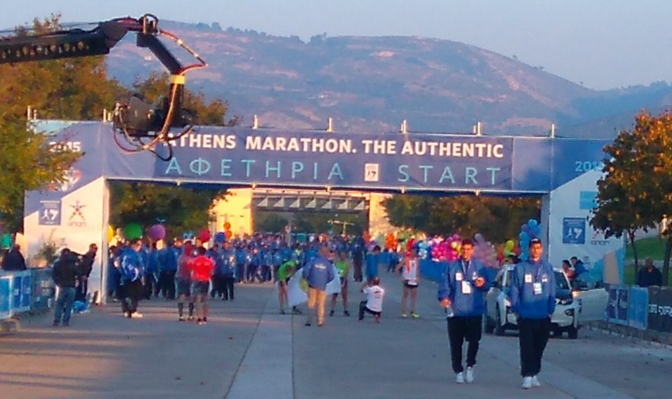 Rozbieram się na płycie stadionu, rzeczy wkładam do mojego worka z naklejonym numerem i oddaje załodze ciężarówki DHL. Wolontariusze rozdają plastikowe worki, nakładam jeden z nich na ciało, aby się nie wyziębić. Od startu dzieli nas pół godziny, także mi udzielił się nerwowy przedbiegowy nastrój, jest ciągle niewysoka temperatura, mimo coraz cieplejszych promieni słonecznych. Jestem już rozgrzany, ale towarzyszy mi niepokój: Czy dam radę?; Czy wczorajsze wyczerpujące zwiedzanie Aten nie odbije się na dzisiejszym biegu? Słońce jest coraz mocniejsze, zrobiło się już znacznie cieplej, można już ściągnąć plastikowy worek. Do startu pozostało z 20 minut, więc przepycham się poprzez tłum biegaczy do właściwej strefy startowej B3. Przed startem wyjątkowa chwila – ceremonia przysięgi olimpijskiej. Wielkie przeżycie, które jest zarezerwowane tylko w tym miejscu, przypomina o miejscu narodzin idei olimpijskiej, ale przede wszystkim przypomina wartości, jakimi powinni kierować się sportowcy. Biegacze podnoszą prawą rękę i składają przysięgę olimpijską, w wielu dłoniach są gałązki oliwne. W moich oczach pojawiają się łzy wzruszenia. Jest godz. 9.00, w oddali słyszymy huk wystrzału startowego, co minutę kolejne strefy ruszają na trasę. Ja już nie czuję niepokoju, teraz został już tylko bieg.