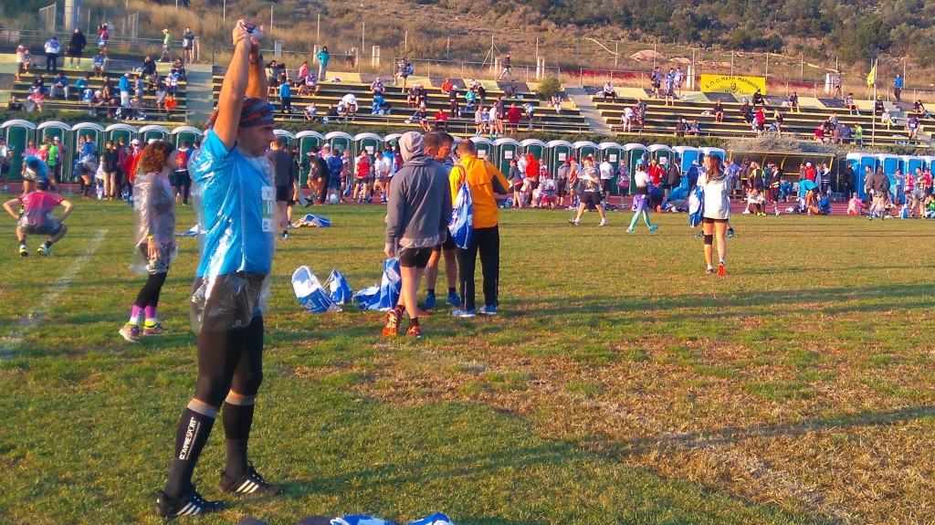 Miasto przywitało nas orzeźwiającym powietrzem i tłumem biegaczy wysypujących się z podjeżdżających autobusów. Licznie zgromadzeni wolontariusze kierują tłum w kierunku stadionu, który położony jest obok linii startu. Ładny lekkoatletyczny stadion z tartanową bieżnią i trawiastą płytą przyjmuje tłumy biegaczy, tam kolorowy wielojęzyczny tłum robi zdjęcia i rozpoczyna rozgrzewkę. Tutaj na płycie stadionu rozmieszczone są liczne toalety, a wolontariusze z kilku stanowisk rozdają biegaczom wodę. Stadion ma także budynek, w którym jest mała restauracja, w której można kupić coś ciepłego do picia i jedzenia, są także szatnie, przebieralnie i toalety.