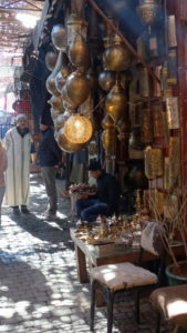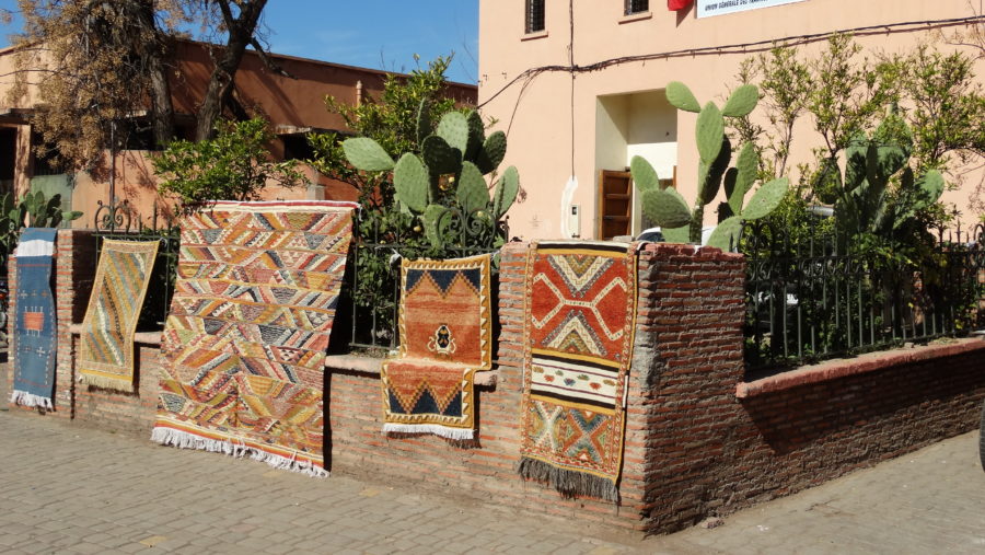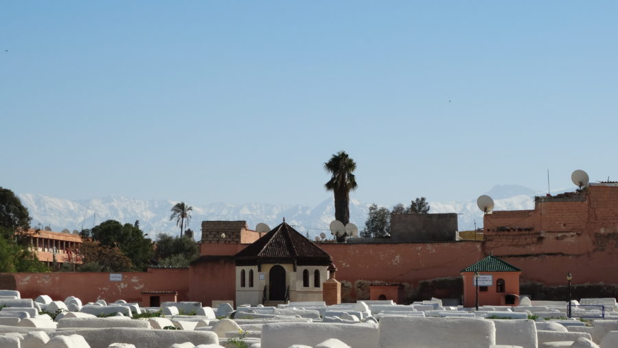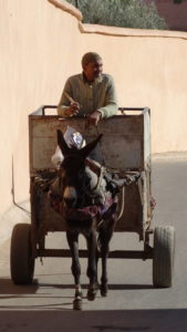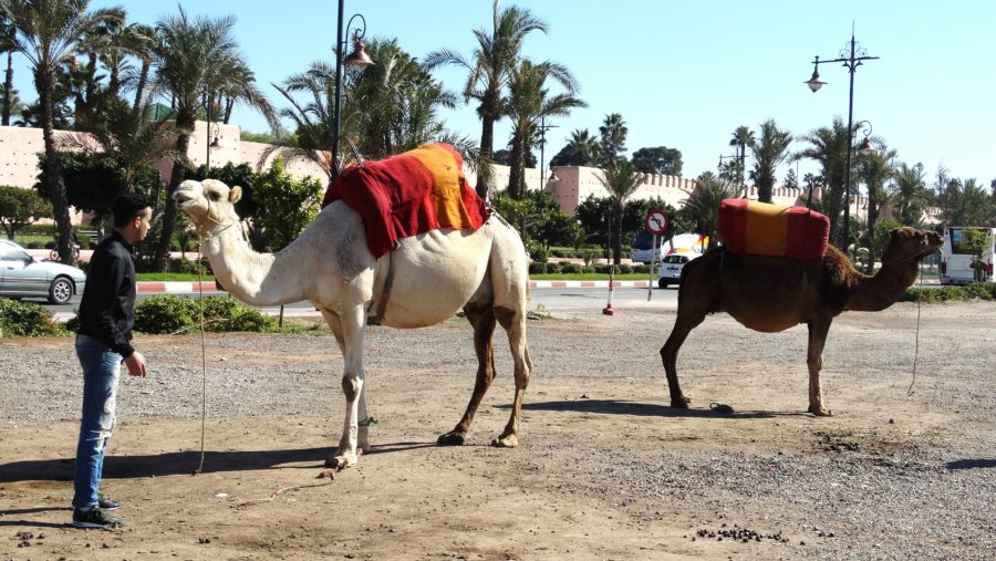 Odległość z lotniska do centrum Marrakeszu nie jest duża, 15-20 minut drogi, odjeżdża stąd także autobus miejski za cztery dirhamy od osoby. Z taksówki oglądamy nocną panoramę miasta, mocno oświetloną lampami ulicznymi i dekoracjami świetlnymi. Kierowca wskazuje pałac królewski i ogrody, które robią na nas duże wrażenie. Przejeżdżamy bramą dwunastowiecznych murów miejskich i jesteśmy już na terenie Medyny. Uliczki Medyny robią się coraz bardziej wąskie, ograniczane zwartą zabudową domów w kolorze czerwonawej gliny. Jest jeszcze sporo ludzi na ulicach, otwarte są niektóre stoiska uliczne i sklepy. W pewnym momencie kierowca taksówki się zatrzymuje i mówi, że dalej już nie pojedzie, i że do Riadu zaprowadzą nas miejscowi. W chwili zatrzymania się taksówki otoczyła nas grupka młodych ludzi, którzy deklarowali, że nas zaprowadzą do Riad Soaud. Nie mając za bardzo wyjścia ani innego pomysłu, poszliśmy z nimi coraz węższymi i ciemnymi uliczkami. Droga do Riadu ciągnęła się w nieskończoność, potęgowana strachem… skończyła się dobrze. Oczywiście, na koniec tradycyjna negocjacja wysokości bakszyszu za przysługę.