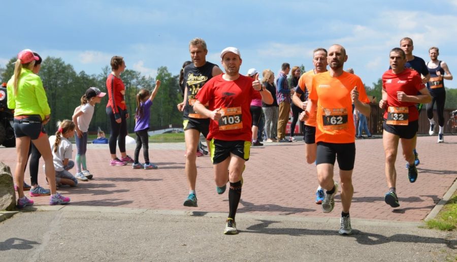 Trzy, dwa jeden… i huk pistoletu startowego uwolnił biegaczy czekających w napięciu na ten sygnał. Uruchamiam swój stoper, kilku zawodników już po paru metrach odskoczyło od zasadniczej grupy. Trzymam się z przodu stawki, pilnując moich upatrzonych kolegów. Biegniemy szybko, po pierwszym kilometrze zegarek pokazuje 3.55 min/km. Wiem, że nie mam szans przez cały bieg utrzymać takiego tempa, i zastanawiam się, czy to nie odbije się później na drugiej części dystansu? Po obiegnięciu zbiornika wodnego, dopingowani przez kibiców i rodziny, skręcamy w lewo na ścieżkę do lasu. Teraz już tylko trakty i ścieżki leśne, często piaszczyste, a czasami błotniste. Stawka biegaczy bardzo się rozciągnęła, ja jestem w trzeciej grupie. Trzymam się mocno kolegów. Tempo biegu wciąż wysokie, ok. 4 min/km. Trasa jest mocno zmieniona, ale nie jest źle. Widać biało-czerwone taśmy, wolontariuszy z grupy medycznej stojących na głównych zakrętach i miejscach zmiany kierunków. Duże białe tabliczki z czarnymi cyframi pokazują przebiegnięty dystans. Zbliżam się połówki, tam ustawiony jest przez organizatorów samochód oraz stolik z kubkami wody mineralnej. Wolontariusze podają kubki biegaczom, wypijam dwa łyki, pytam, czy ktoś potrzebuje wody, pojawia się wyciągnięta ręka, której przekazuję kubek.