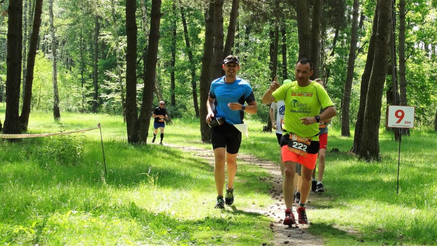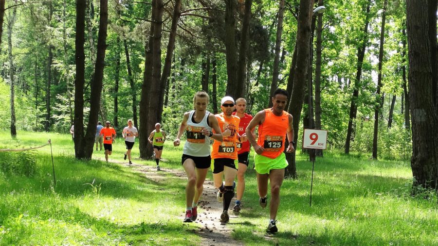 Słońce, ukryte do tej pory za chmurami, pokazało się w całej okazałości, co nie pomagało biegającym. Zbliżała się połówka biegu, w oddali widać było samochód organizatorów, gdzie ustawiony był stolik z kubkami wody mineralnej. Wolontariusze sprawnie podawali kubki do rąk. Łapię czas: 20.27. Nieźle! Dogadujemy się z Łukaszem, że tempo jest za wysokie i trochę zwolnimy. Zresztą na szóstym kilometrze zaczynają się piaszczyste podbiegi, które i tak wymuszają mniejszą prędkość. Na następnym kilometrze utrzymujemy ciągle wysokie tempo 4.14, mimo to z tyłu słyszę coraz silniejszy tupot nóg i głośniejsze oddechy. Po chwili trzech młodych zawodników, jeden po drugim nas wyprzedzają. Przez moment dotrzymujemy im tempa, ale odpuszczamy, do mety zostało ok. 2,5 km. Ja coraz wyraźniej czuję ból w łydkach, zwiększona intensywność treningów dała o sobie znać. Łukasz też ma dość i proponuje, żebym biegł sam, skoro mam siłę. Nie zgodziłem się, próbujemy się wzajemnie mobilizować, do mety zostało 1,5 km, z tego 600 metrów przez las i okrążenie wokół zbiornika.