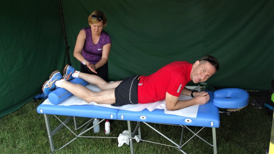 Rozgrzewając się do mojego koronnego dystansu, skorzystałem z usług fizjoterapeutów MOSiR, których stoisko zawsze towarzyszy tym zawodom. Jak już wspominałem, od tygodnia zwiększałem intensywność treningową, odbiło się to na moich mięśniach, które wyraźnie odczuły zwiększony kilometraż. Lekki ból w łydkach towarzyszył mi od kilku dni. Pani Magda, fizjoterapeutka, robiła, co mogła, aby rozluźnić moje spięte łydki. Masaż przyniósł mi małą ulgę i rozgrzał mięśnie do startu.