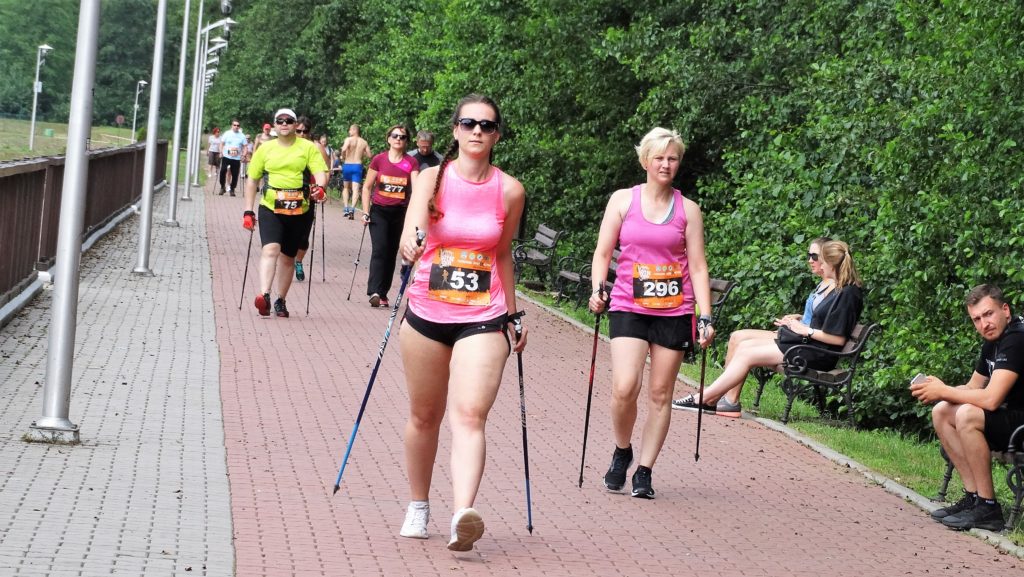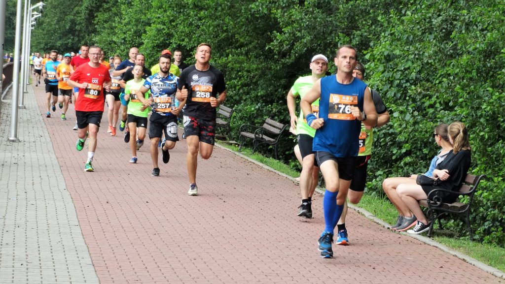 Dzisiaj w maratonie na raty bierze udział 96 zawodników. Ustawiam się w strefie startowej, tuż za faworytami biegu. W strefie jest mój kolega Krzysiek Komar, rywal ze wspólnej kategorii wiekowej. Nie biegnie dziś Marek Matysiak, drugi poważny kandydat do wygrania kategorii M50. Odruchowo obserwuję, do kogo się mogę przykleić na trasie zawodów. Kto biega na moim poziomie? Jest wokół mnie grupa biegaczy o podobnym przygotowaniu, więc będziemy się wspólnie dopingować. Spiker po krótkim odliczaniu wydaje komendę: start! Grupa pięcio-, sześcioosobowa już na pierwszym metrach trasy uzyskuje kilkumetrową przewagę, którą systematycznie powiększa. Jest tutaj faworyt całej edycji – Sylwek Lepiarz, ale też inni nie gorsi zawodnicy – Michał Jagieło czy Zbyszek Dulemba. Ja biegnę w drugiej, kilkuosobowej grupie zawodników, tempo dość wysokie oscylujące na pierwszym kilometrze między 3.54–4.02. Ostatnia prosta przy zbiorniku i mocno dopingowani przez kibiców skręcamy w lewo, na leśną ścieżkę. Trasa w lesie nie jest najgorsza, choć momentami grząska. Tempo biegu dalej wysokie na poziomie 4.02–4.05. Biegnę obok etatowej faworytki wśród kobiet – Kingi Kacugi, której poprzedni bieg trochę dokuczył, dlatego zawodniczka deklaruje, że nie będzie dziś mocno walczyć. Po dwóch, trzech kilometrach pozostawiam moją grupkę z tyłu, zbliżając się do biegaczy, którzy zostali z pierwszej grupy. Biegnie mi się dobrze, boję się tylko, czy wytrzymam dość wysokie tempo. Słońce jest wciąż za chmurami i mimo że jest dość duszno, pogoda sprzyja biegaczom. Zbliżam się do młodego biegacza, który został w tyle dość mocno rozciągniętej pierwszej grupy, doganiam go, przez chwilę biegniemy razem i pozostawiam go za sobą. Przede mną biegnie w odległości może 50-60 metrów kolega, Przemek Pronobis.