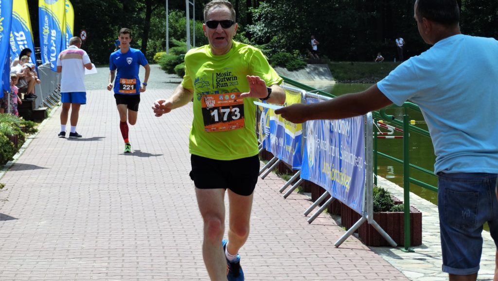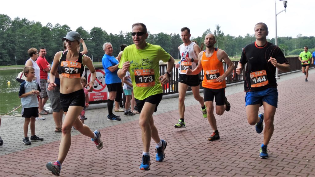 Przez pół kilometra biegnę sam. Na czwartym kilometrze z tyłu słychać coraz mocniejsze kroki i oddech. Po chwili wyprzedza mnie kolega biegowy Sławek Niedziela i… nic nie mogę zrobić. Tempo dalej wysokie: 4.05–4.10. Na piątym kilometrze jest punkt z wodą zapewnioną przez organizatorów. Punkt osobiście wspiera Grzesiek Bażant, szef tych zawodów, sam przekazuje w ręce biegaczy kubki z wodą. Chwytam jeden z nich, wypijam trzy łyki, reszta wody ląduje na moim karku. Biegnę długą prostą przez las, świadomy, że za kilometr czeka mnie podbieg pod piaszczystą górkę, która mocno wybija z rytmu i męczy. Z tyłu znów słyszę coraz głośniejsze kroki i równy oddech, ktoś mocno przyspieszył. Przed samym piaskowym wzniesieniem mija mnie Konrad Sulik, który jest w tym roku w wysokiej triathlonowej formie, co przekłada się na śrubowanie wyników na Gutwinie. Nie próbuję dotrzymywać mu kroku, piaskowa górka mocno mnie wybija z rytmu. Po jej sforsowaniu, ciągle sam próbuję gonić będących w zasięgu wzroku dwóch zawodników, ale nie daję rady. Udaje mi się utrzymywać tylko podobną odległość od nich. Tempo delikatnie spadło, ale ciągle na 7. i 8. kilometrze wynosi 4.10–4.15. Skręt w prawo, za chwilę w lewo i ostatni odcinek przez las, to dziewiąty kilometr. Z tyłu też słyszę, że ktoś z biegaczy próbuje mnie gonić. Już w oddali słychać okrzyki kibiców, zbliżam się do ostatniej kilometrowej rundy wokół zbiornika. Wpadam na chodnik, wiem, że zostało 900 metrów, przede mną w zasięgu kilkudziesięciu metrów dwóch zawodników, z tyłu ktoś mnie próbuje dogonić. Przyspieszam, na zakręcie zerkam, jaką mam przewagę nad goniącym mnie biegaczem. Nie jest to duża odległość, może 15 metrów, ale nie odpuszczam. Ostatnie 60 metrów sprintu, łapię czas na mecie: 42.27 i 7. miejsce open. To najlepszy czas osiągnięty przeze mnie w tym roku na Gutwinie. Umacniam się na prowadzeniu w mojej kategorii wiekowej M50. Na mecie czeka woda mineralna, pączek i talon do restauracji. Na koniec korzystam jeszcze raz z masażu u Pana Tomka. Gratuluję kolegom i czekam na następną rundę i dalsze emocje.