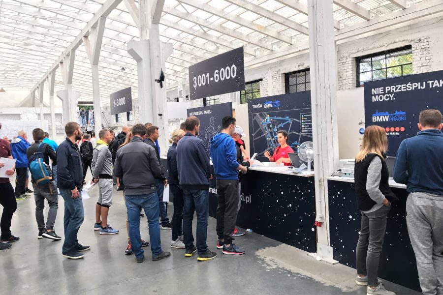 Zapisy do czwartej edycji BMW Półmaratonu Praskiego zaczęły się już praktycznie po zakończeniu poprzedniej. Cena pakietu startowego kształtowała się od 79 zł w najwcześniejszym terminie, przez 87 zł, 99 zł, po 120 zł przed samym startem. Dość wysoka cena pakietu była adekwatna do jego zawartości. Pakiet zawierał koszulkę techniczną 4F z logo BMW i designerskim wzorem, numer startowy, świecącą opaskę na rękę, trochę materiałów reklamowych, a wszystko to w ładnym worku z materiału, przygotowanym jako worek depozytowy. Pakiet startowy można było odbierać przez dwa weekendy poprzedzające zawody, dobrym rozwiązaniem dla biegaczy spoza Warszawy była możliwość jego odbioru także w dniu imprezy do godziny 18. Biuro zawodów zostało zorganizowane na ul. Mińskiej 25, w dużej hali przypominającej szklarnię, niestety przez słabe oznakowanie niełatwo tam było trafić. W środku – spora przestrzeń wypełniona stanowiskami do odbioru pakietów startowych, nielicznymi stoiskami handlowymi z akcesoriami biegowymi oraz strefą do leżakowania i wypoczynku. Sponsor imprezy (BMW) prezentował swój superekologiczny miejski samochód elektryczny na tle ogromnej ścianki, na której uczestnicy zawodów składali swoje autografy. Całość była ozdobiona ciekawymi planszami reklamującymi BMW Półmaraton Praski.