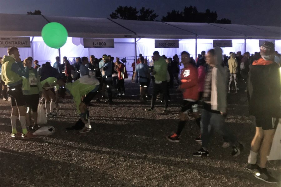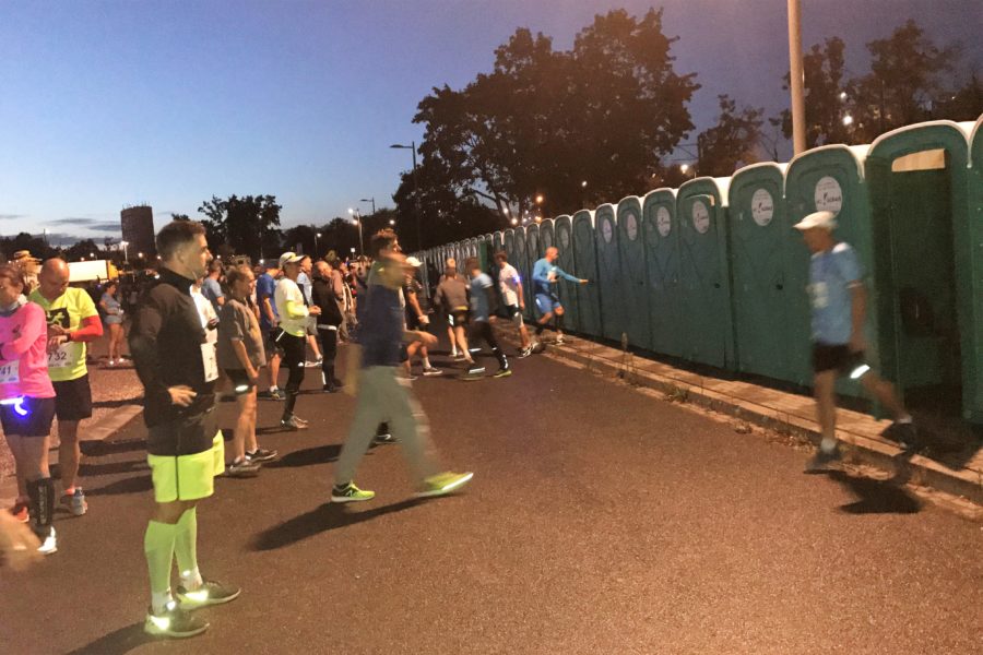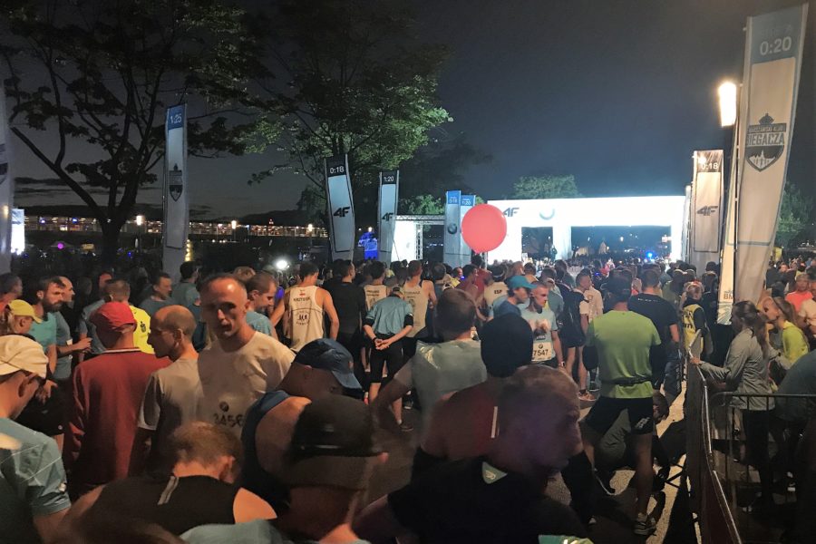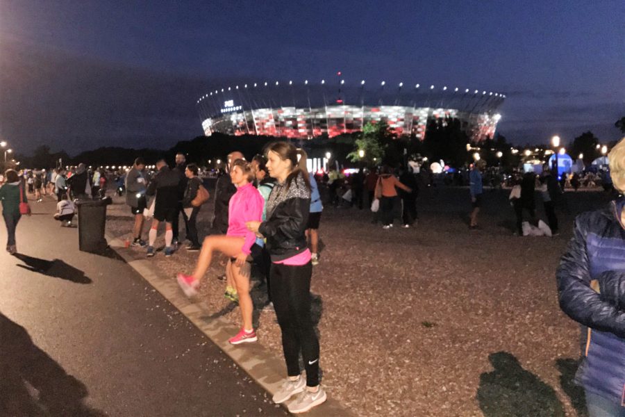 O godzinie 20.30 przy zachmurzonym niebie było już bardzo ciemno. Całe szczęście, że ustała mżawka, która dokuczała popołudniem w Warszawie, ale za to zrobiło się jeszcze zimniej. Tysiące biegaczy próbowało się jakoś rozgrzać do startu, co w tych warunkach, tzn. przy jednym odcinku dostępnej drogi, nie było takie proste. Słabo rozgrzany postanowiłem przemieścić się do swojej strefy startowej. W strefie było bardzo tłoczno, zrezygnowałem więc z próby dogrzewania mięśni. Niestety, nikt nie pilnował, czy zawodnicy ustawiają się we właściwych strefach. W tym czasie spiker przedstawiał zawodników z pierwszymi numerami startowymi, rozpoczął się pokaz laserowy, zbliżała się godzina startu. W mojej strefie startowej niedaleko ode mnie stali dwaj pacemakerzy (na 1.30), z dość niezwykłymi, jak na biegi uliczne, balonami. Duże okrągłe balony wypełnione helem, podświetlone zmieniającymi się kolorami, w ciemności wyglądały iście magicznie, podobnie jak migające opaski na rękach rozdane biegaczom w pakietach startowych. Zbliżał się moment startu. Pierwsi na trasę mieli wyruszyć zawodnicy na wózkach, po nich za chwilę wyruszą biegacze.