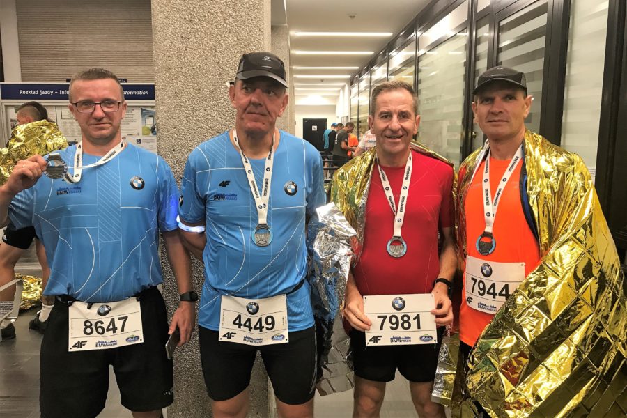 Mijam już połowę dystansu, zbliża się ostatni w tej części trasy zakręt w lewo na Wał Miedzeszyński. Tam, po półtorakilometrowym prostym odcinku, będzie nawrotka i prawie siedmiokilometrowy prosty odcinek wzdłuż tej drogi. Na tym odcinku przed nawrotką mogłem obserwować po drugiej stronie drogi czołówkę półmaratonu, która w błyskawicznym tempie znikła z pola widzenia. Po ostrej nawrotce organizatorzy umieścili czwarty punkt nawadniania na trzynastym kilometrze, na którym tempo mojego biegu spadło do 4.10. Następny kilometr znów biegnę szybciej, ciągle mam sporo energii. Na 15 km jest lekki i chyba jedyny podbieg na trasie, który skutecznie obniżył moje tempo na tym odcinku do 4.14, ale już następne dwa kilometry pokonuję w tempie 4.11. Na 17. kilometrze biorę kolejny żel energetyczny, który pomoże mi przy finiszu, tam też był ostatni punkt nawadniania na trasie. Od 18 km udaje mi się przyspieszyć, nie wiem czy to zasługa żelu, czy widoku Stadionu Narodowego, na którym zaliczyłem swój debiut maratoński w roku 2013. Tak naprawdę nieważne czyja to zasługa, ale 19 km przebiegłem w tempie 4.02, a 20 km w tempie 3.56. Nie umiem wytłumaczyć, skąd u mnie tyle energii, ale na ostatnich dwóch kilometrach trasy udało mi się wyprzedzić kilkunastu zawodników. Już wiedziałem, że dam radę utrzymać tempo i będę miał dobry wynik. Ostatnia nawrotka i zostało około półtora kilometra do mety. Wokół trasy mnóstwo dopingujących kibiców, nagle trasa skręca w lewo, później prowadzi przez krótki tunel i kolejny zakręt w lewo, ostatni 21 km pokonuję w tempie 4.05.