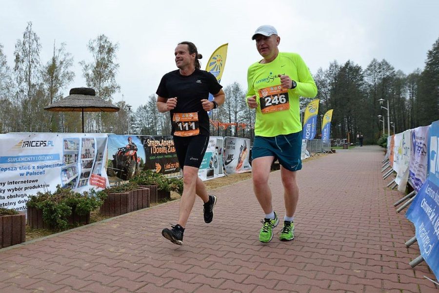 Wystrzał pistoletu startowego uwalnia biegaczy. Już na pierwszych stu metrach widać szybkość najlepszych zawodników, których przewaga z każdym metrem szybko rośnie. Po chwili pierwsza grupa skręca w lewo i znika wraz ze ścieżką w lesie. Dopinguję jeszcze przez kilka chwil pozostałym biegaczom, którzy po przebiegnięciu małej pętli wokół zbiornika skręcą zaraz w lewo i znikną w lesie, podobnie jak pierwsza grupa. Mam teraz czas na rozgrzanie moich mięśni w nogach na stanowisku masażu i lekką rozgrzewkę. W tym czasie na metę przybiegają pierwsi zawodnicy. Pod nieobecność Sylwka Lepiarza zwycięża Jan Popławski z Ostrowca Św. Po masażu i rozgrzewce jestem gotowy do startu. Do mety dotarli już wszyscy biegacze i zawodnicy nordic walkingu, którzy startują bezpośrednio po biegaczach półmaratonu na raty. Do startu zostało kilka minut, rozglądam się po zawodnikach, oprócz wspomnianego Lepiarza nie ma też Kingi Kacugi, więc faworytem będzie Zbyszek Dulemba. Nie brakuje za to dzisiaj moich kolegów, z którymi bezpośrednio rywalizuję na Gutwinie. Widzę Przemka Pronobisa, Pawła Wośka, Konrada Sulika, Sławka Niedzielę czy Roberta Gładysia. Startuje dziś także mój główny rywal w kategorii M50 – Krzysiek Komar. Mam więc z kim się ścigać, chociaż ostatnia runda dla niektórych jest jak partia szachów, czysta kalkulacja. Ja nie potrafię kalkulować, mam już pewne zwycięstwo w swojej kategorii, ale będę walczył jak zwykle na maksa.