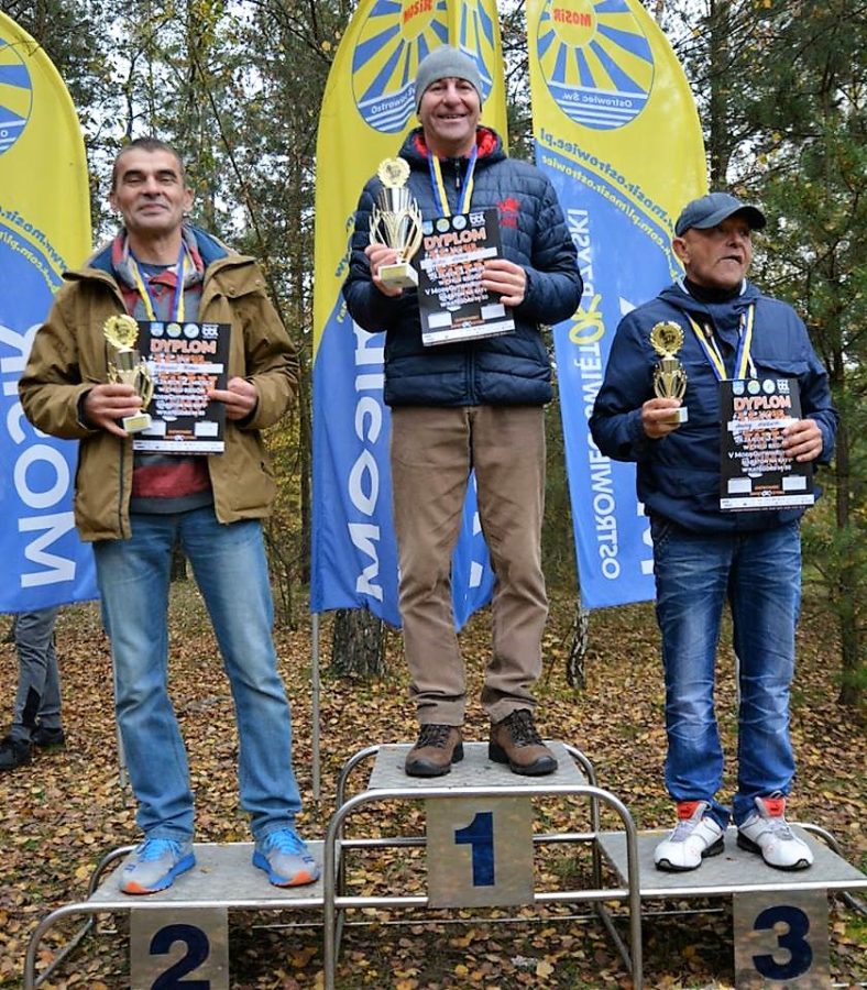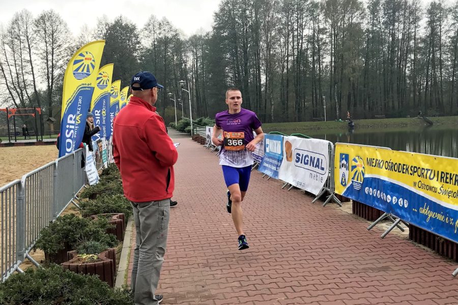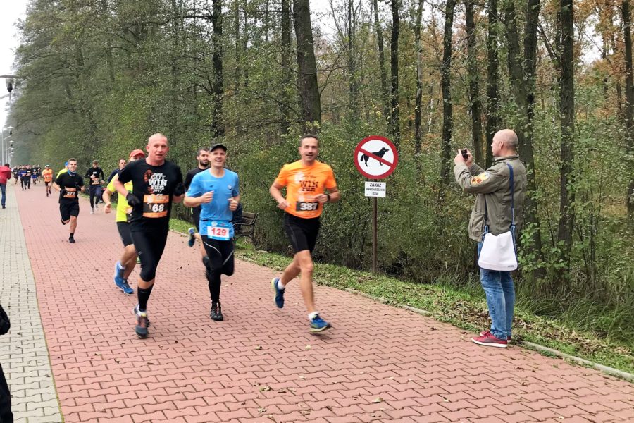 Wychodzę na prowadzenie w grupie i zostaję praktycznie sam na trasie biegu, powoli zbliżam się Roberta Gładysia ze Starachowic, przed nami uciekające sylwetki dwóch zawodników. Czwarty kilometr pokonuję w tempie 4.02, a piąty kilometr, na którym ustawiony jest punkt nawadniania, w tempie 4.08. Na punkcie łapię dwa plastikowe kubki wody podawane przez wolontariusza, wypijam dwa łyki, reszta mi się wylewa. Jestem jedyny, który sięga po wodę, to trochę mnie wybiło z rytmu biegowego i muszę nadrabiać straty do Roberta. Na tym odcinku dogania mnie, już chyba tradycyjnie w tej edycji, Sławek Niedziela i… wyprzedza. Ja doganiam na chwilę Roberta. Na szóstym kilometrze trasy znajduje się piaszczysty podbieg. Tutaj mój rywal odskakuje ode mnie na kilka metrów i nic nie mogę zrobić. Znów na trasie zostaję sam, widząc w niedalekiej odległości plecy moich kolegów. Tempo mojego biegu spadło do 4.09-4.11. Ósmy kilometr podobnie: 4.12, próbuję walczyć o to, żeby dystans do biegaczy przede mną nie wzrastał. Trasa na tym odcinku nie jest najgorsza, niestety pojawia się znów więcej liści, co skutkuje u mnie kilkoma niebezpiecznymi zachwianiami równowagi. Wyraźnie łapię drugi oddech, przyspieszam, zbliżam się do dwóch biegaczy, jednym z nich jest Sławek Majchrzak ze Starachowic, a drugim Andrzej Leśniewski, mieszkaniec Ostrowca, których także wcześniej wyprzedzili Robert i Sławek.