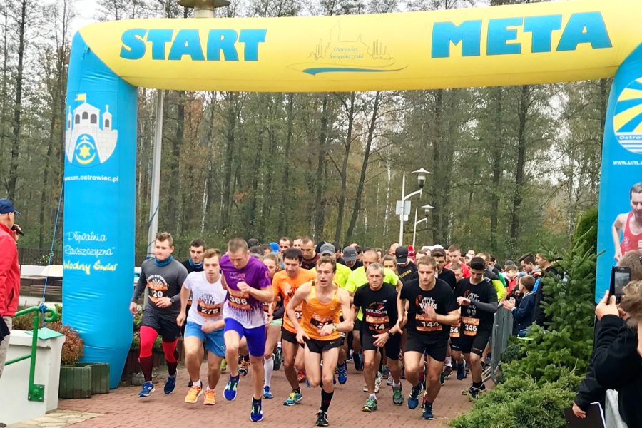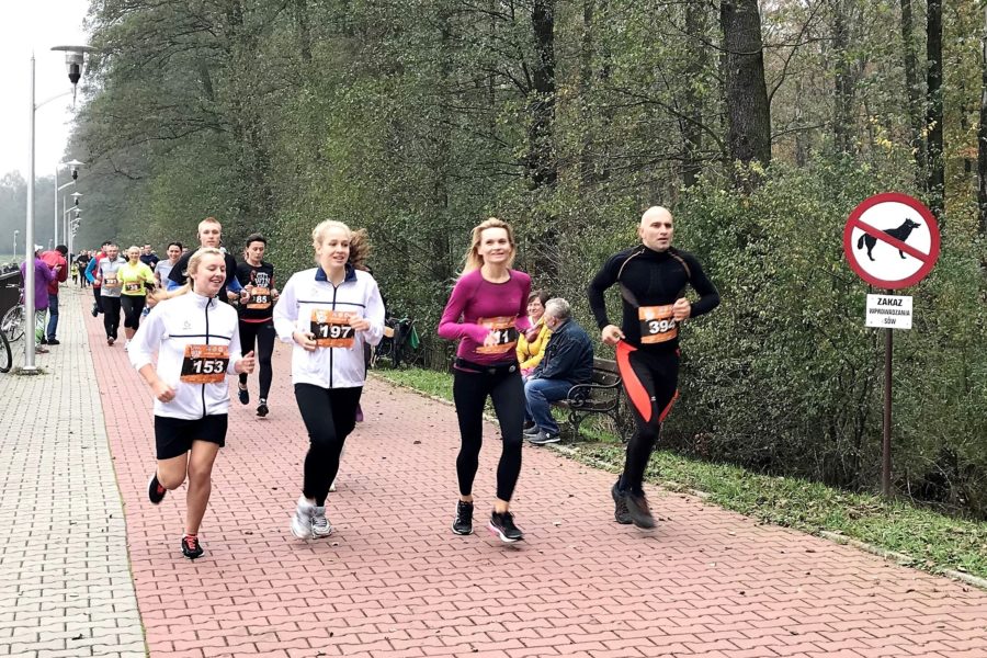 Pada strzał z pistoletu startowego – Grzesiek Bażant dał sygnał do startu. Na tym dystansie wystartowało 76 zawodników, może to nie rekordowa liczba, ale jednak sporo. Już po chwili kilku biegaczy osiągnęło niewielką przewagę nad zasadniczą grupą, która też się podzieliła. Za czołówką biegnie kilkuosobowa grupka biegaczy, później następna, w której jestem ja. Tempo pierwszego kilometra na trasie wokół zbiornika nie za wysokie: 4.04. Przy dopingu zgromadzonych kibiców opuszczamy teren ośrodka, odbijając z chodnika w lewo na ścieżkę w stronę lasu. Teraz czeka nas prawdziwy cross, ponieważ przez kilka dni padał deszcz i trasa zrobiła się błotnista i dość śliska. Już po pierwszym kilometrze stawka biegaczy mocno się rozciągnęła. Pogoda sprzyja biegaczom, wciąż nie pada, ale największym problemem nie są kałuże i błoto, ale zalegające liście, które zasłaniają podłoże, stwarzając niebezpieczeństwo potknięcia się czy skręcenia kostki. Takie są niestety uroki jesiennego biegania po lesie. Następny kilometr po wąskiej ścieżce przez las pokonuję w tempie 4.09, dopiero po skręcie na dukt leśny tempo wzrasta do 4.00. Nasza kilkuosobowa grupa mocno się rozciągnęła, z przodu widać plecy kilku biegaczy, którzy zostali z tyłu grupy przed nami. Trasa biegu wciąż nie jest zła, trochę błota i kałuż, ale do zniesienia.
