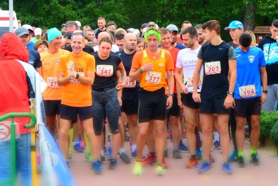 Poranek wrześniowej niedzieli był deszczowy i wietrzny. Nie wróżyło to dobrze dzisiejszym biegom. Nie było jakoś specjalnie zimno, ale dość mocno padało, więc warunki na trasie w lesie będą ciężkie. Nie wiedziałem, jak się ubrać do deszczowego biegu, więc postawiłem na minimum – im mniej na sobie, tym lżej. Gdy dojechałem na Gutwin, na parkingu przed ośrodkiem nie było tłoku. Przy takiej pogodzie większość zawodników przyjedzie na miejsce tuż przed startem. Pod ochroną parasola i ciepłej kurtki udałem się do biura zawodów potwierdzić udział w biegu na dystansie maratonu na raty. Przed biurem sporo osób chroniących się przed deszczem pod dachem pawilonu. Pogadałem ze znajomymi, nic nie wróżyło zmiany pogody. Niechętnie wróciłem do samochodu, aby się przebrać do startu. Pod ciepłym ubraniem miałem przezornie założony strój biegowy. Chciałem się jakoś rozgrzać przed biegiem, więc założyłem na koszulkę biegową cienką kurtkę przeciwdeszczową. Do startu został kwadrans, nagrałem coniedzielny filmik motywujący i udało mi się jakoś przeprowadzić rozgrzewkę. Zostawiłem przemoczoną kurtkę w samochodzie i biegiem przemieściłem się na linię startu. Tam jak zwykle ruch i zamieszanie. Z faworytów pojawił się Michał Karasiński, zabrakło wielu dobrych biegaczy z Sylwkiem Lepiarzem czy Michałem Jagieło na czele. Łącznie wystartowało na tym dystansie 88 zawodników. Brak czołówki absolutnie nie oznaczał, że to będzie słaby i pozbawiony emocji bieg. Pojawili się moi konkurenci: Konrad Sulik, Przemek Pronobis, Piotrek Bajer czy Łukasz Rogoziński, co gwarantowało walkę do upadłego. Punktualnie o godz. 9.30 padła komenda start, Michał Karasiński mocno wyrwał do przodu, zostawiając z tyłu resztę kolegów biegaczy. Michałowi kroku próbował dotrzymać jedynie Eryk Szczęśniak z Masłowa. Ja trzymałem się Konrada Sulika, Piotrka Bajera i Przemka Pronobisa. W rywalizację włączyli się też Łukasz Rogoziński i Kacper Chodakowski – nasza utalentowana młodzież.