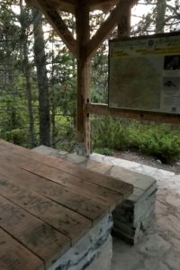 koryto potoku, wypełnione dużymi głazami. Ziemia w tym miejscu była dość grząska, pewnie w wyniku ostatnich opadów deszczu. Po przebrnięciu przez grzęzawisko szlak odbijał mocno w górę, już po kilku minutach zrobiło mi się gorąco, mimo że temperatura otoczenia spadła. Po chwili dotarłem do murowanej wiaty, zorganizowanego miejsca wypoczynku ze stołem, ławami oraz tablicą z mapą pasma Olimpu. Tuż obok znajduje się obmurowane źródełko wody pitnej. Na trasie powyżej będzie jeszcze jedno źródełko z wodą, dlatego warto tam uzupełnić zapasy wody. Zatrzymuję się na moment, zerkam na mapę, wypijam kilka łyków wody i ruszam dalej na szlak. Szkoda mi każdej chwili, nie wiem, ile czasu zajmie mi wejście na szczyt. Zostawiam las z tyłu, na trasie coraz więcej skarłowaciałych formacji leśnych. Szlak coraz częściej biegnie po ścieżkach skalnych. Nie zatrzymując się, mijam rozwidlenie szlaków i trasę do „Christos Kakalos” Refuge C. Zbliżam się już do schroniska, które mnie interesuje „Spilios Agapitos”, Refuge A. Po drugiej stronie doliny, na występie skalnym, przebija się między drzewami czerwony kolor jego