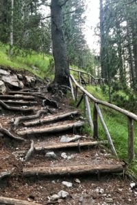 Trasa zmieniała kształt stając się wąską, stromą ścieżką pełną śliskich kamieni. Musiałem bardzo uważać, żeby się nie pośliznąć i nie upaść, zmrok wciąż otulał gęsty las. Generalnie szlak do schroniska jest dobrze oznaczony. Przeważnie są to drewniane słupki z oznaczeniem >E4<, drewniane tabliczki na rozwidleniach dróg, a powyżej schroniska znaki z czerwonej farby na skałach.
