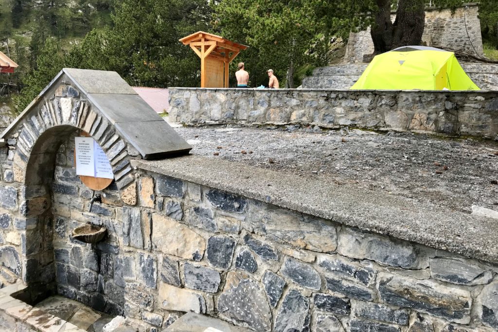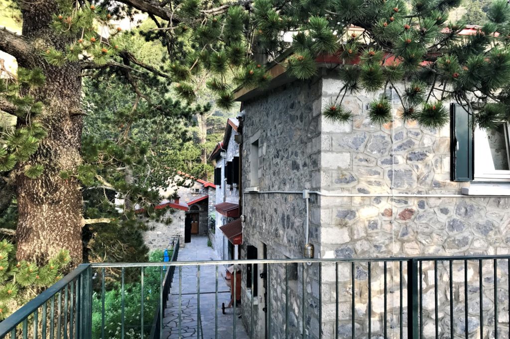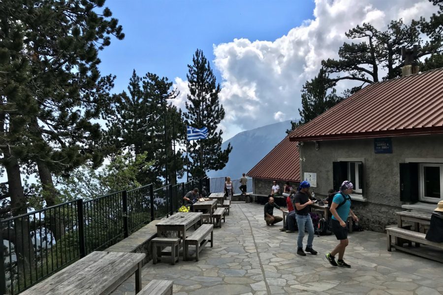 Z holu można przejść do dwóch dużych jadalni umieszczonych po prawej i lewej stronie pomieszczenia. Część hostelowa schroniska znajduje się w najbardziej oddalonym odcinku rozbudowanego przez lata budynku, który mieści 110 miejsc noclegowych. Schronisko, jak dowiedziałem się już po zejściu, posiada także WiFi. Po obejrzeniu części gastronomicznej schroniska znalazłem spokojny stolik na zewnątrz obiektu. Tam zjadłem śniadanie – dwie słodkie bułki z miodem i figami, dzieląc się nimi ze wspomnianymi pieskami. Śmieci schowałem do plecaka, spełniając prośbę właścicieli zamieszczoną na ścianie budynku (aby swoje śmieci zabierać ze sobą i wrzucić do specjalnie przygotowanych pojemników na parkingu w Prioni). Muszę tutaj dodać jedno zdanie. Na całej trasie z Prioni na szczyt Mitikas nie spotkałem porzuconego ANI JEDNEGO ŚMIECIA, BUTELKI itp. Byłem dumny z ludzi – ich odpowiedzialności. Generalnie Grecja jest krajem zaśmieconym, a na Olimpie śmieci brak! Szok! cdn.
